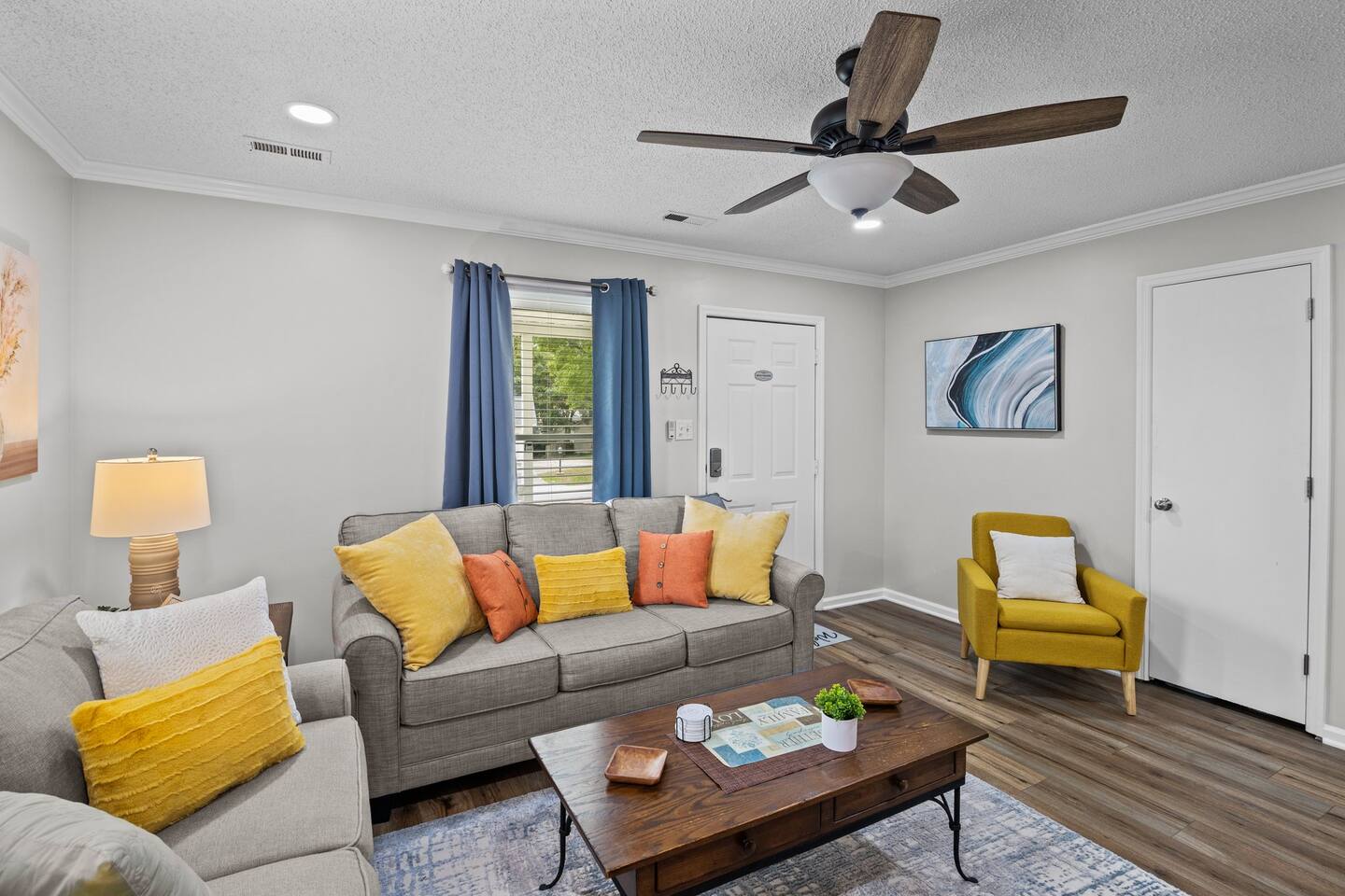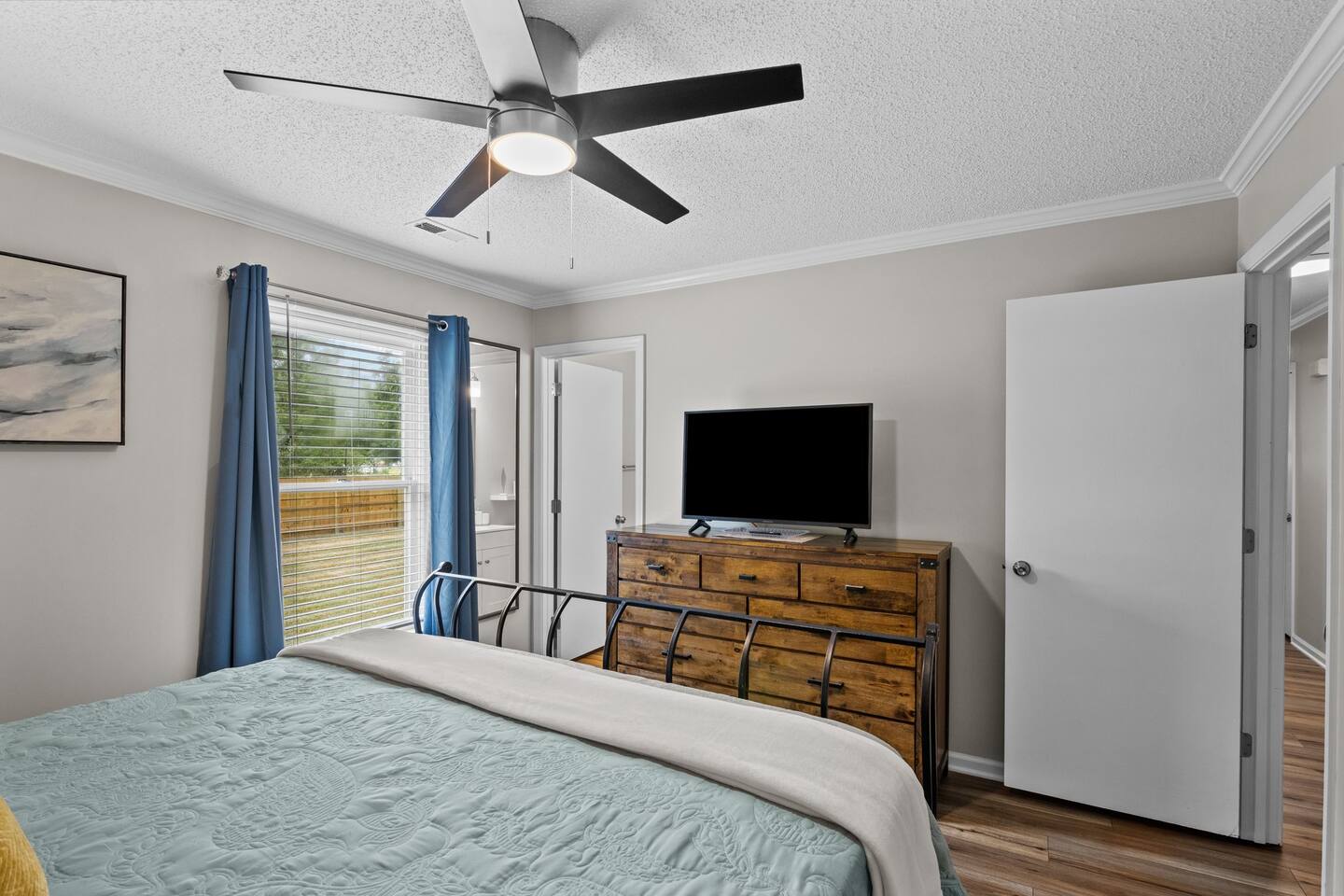 1100 square foot home | 50" TV | TVs in every room | King Bed | Fenced yard Our home is dog friendly (no cats) with an additional pet fee of $125. Bring the family! LIVING ROOM Enjoy watching a 50 inch flat screen TV from comfy leather sofas in the living room. There is a small desk/ work station with fast Wi-Fi, great for setting up your laptop in the kitchen. Waterproof, durable LVP flooring makes hosting pets a breeze! MASTER BEDROOM The comfortable master suite features king size bed with large dresser and private bathroom. Stream your favorite shows on a 43" Roku TV. All beds and pillows are fully encased. All bedroom closets have extra blankets. MASTER BATHROOM Enjoy a private master bathroom all to yourself. Shampoo, conditioner, body wash, hand soap, towels, and wash clothes are provided. MASTER CLOSET The master closet has extra blankets, plenty of hangers, and a pack n' play for families with toddlers. KITCHEN The kitchen table seats 6 adults comfortably. The kitchen itself is fully stocked with all the utensils and appliances needed to prepare home-cooked meals. We provide Keurig and drip coffee makers, coffee, creamer, and sweeteners. A full laundry closet is located in the kitchen as well. 2 ADDITIONAL BEDROOMS The other two cozy bedrooms share a full bath. One bedroom features a queen size bed, dresser, closet, and smart TV. The other bedroom has two twin beds, a small dresser in the closet, and a wall-mounted Roku TV. BACKYARD The large, fenced-in backyard is perfect for kids and pets. Privacy fence makes it feel like your own private oasis. Enjoy a cup of morning coffee on the back porch with table and two chairs. PARKING The driveway easily holds three cars and extra cars are welcome to park on the grass and on the street in front of the house. Travelers with work trailers, boat trailers, or RVs will have room to back in the driveway and park in the grass by the house. LAUNDRY Free on-site washer and dryer. We provide a couple of laundry pods and dryer sheets. Iron and ironing board are provided. GENERAL Free Wi-Fi Towels and linens provided Shampoo, conditioner, body wash provided Drip coffee and Keurig Free in-unit washer and dryer Central heat and AC Hangers, iron, ironing board Trash bags, paper towels, napkins LOCATION 2 miles from Bosch 2.6 miles from Neighborhood Walmart 4.5 miles from Carolina East Medical Center 6 miles from downtown where you will find Union Point Park, Tryon Palace, the Birthplace of Pepsi Cola, and the Bear Towne Escape Room to name a few 6 miles from Weyerhauser 9 miles from Lawson Creek park with public boat/ kayak launch 11 miles from the Coastal Carolina Regional Airport 26.5 miles from Cherry Point 45 miles from Atlantic Beach